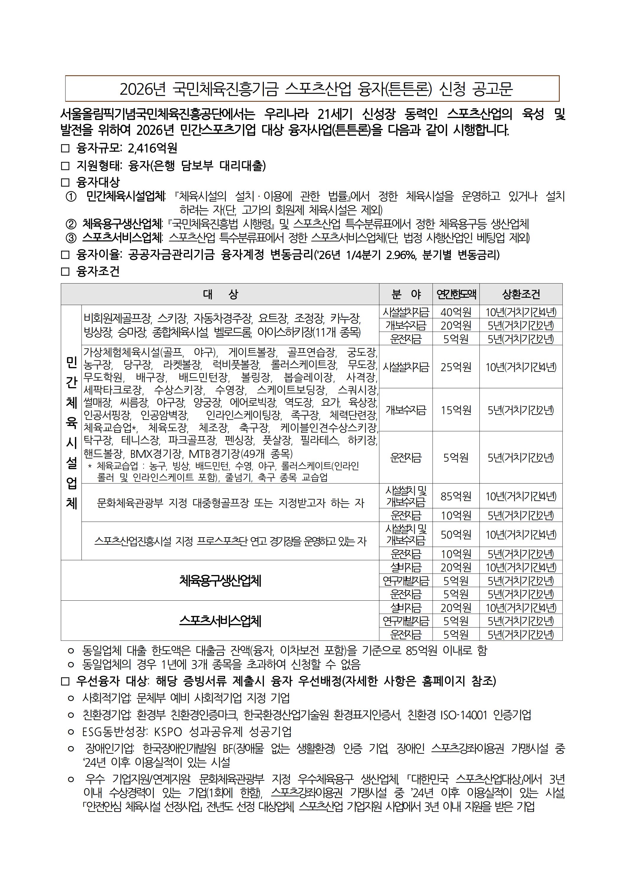 | ‒ | [국민체육진흥공단] 2026 스포츠산업 융자(튼튼론) 신청 공고 |