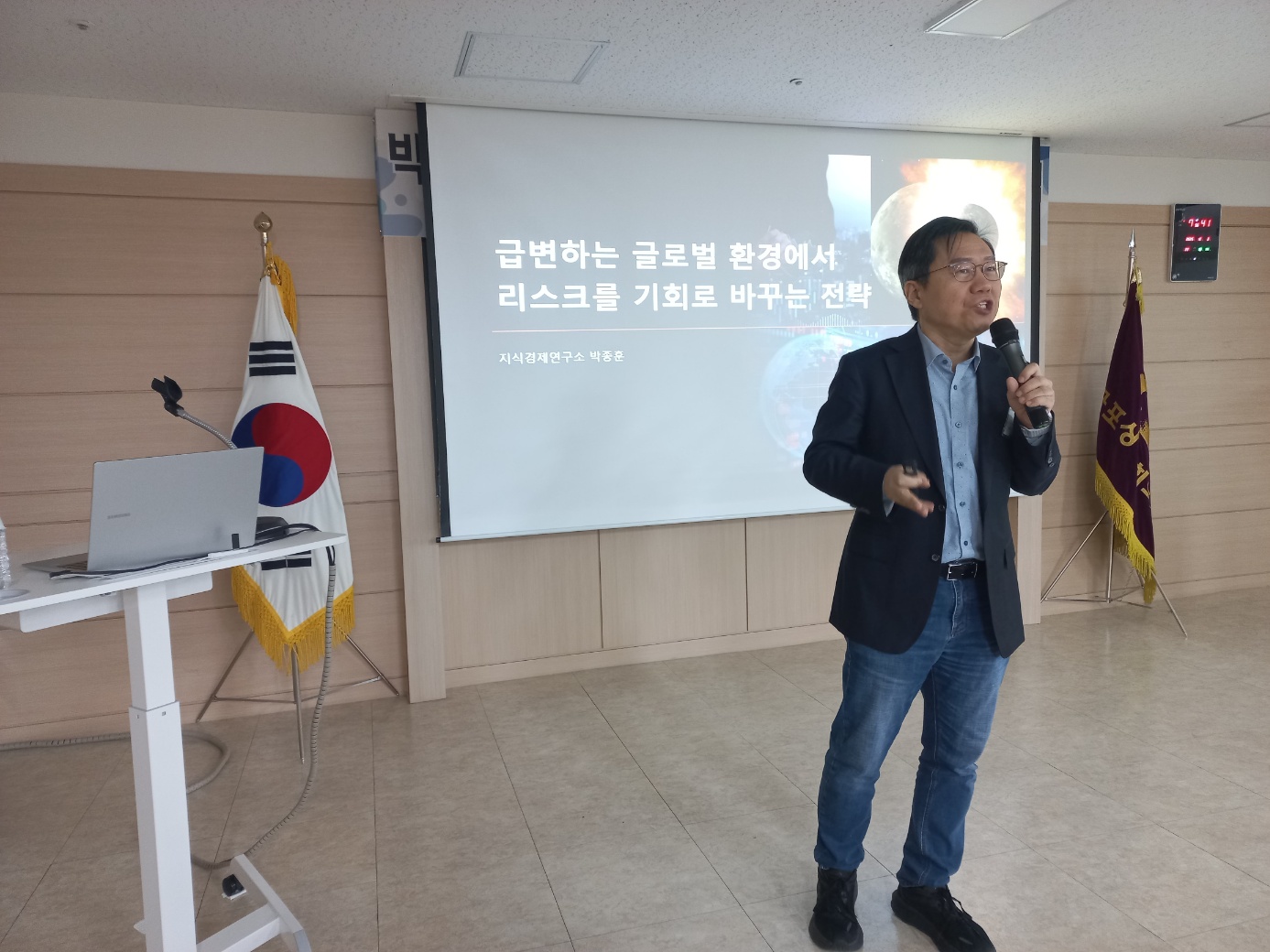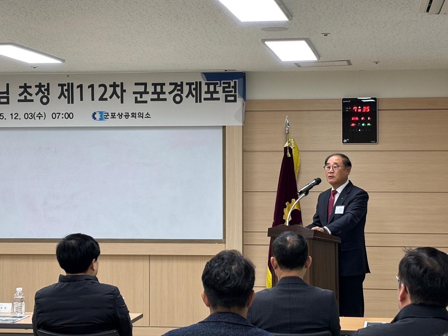 군포상공회의소(회장 김용일)은 12월 3일 제112차 군포경제포럼을 개최하였다. 이날 군포경제포럼은 간단한 조찬과 함께 진행되었으며 하은호 군포시장, 임성호 군포우체국장 등과 많은 상공인들이 참석한 가운데 군포경제포럼을 개최하였다. 제112차 군포경제포럼에서는 박종훈 소장을 초빙하여 “급변하는 글로벌 환경에서 리스크를 기회로 바꾸는 전략”이라는 주제로 강연하였고, 강연 이후, 참가자들의 질의 응답 시간을 갖기도 하였다. |