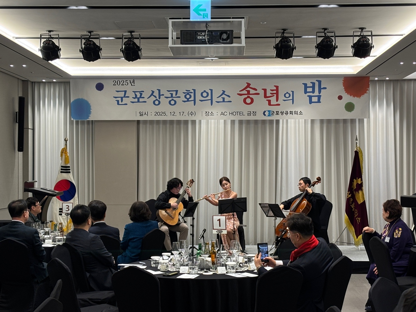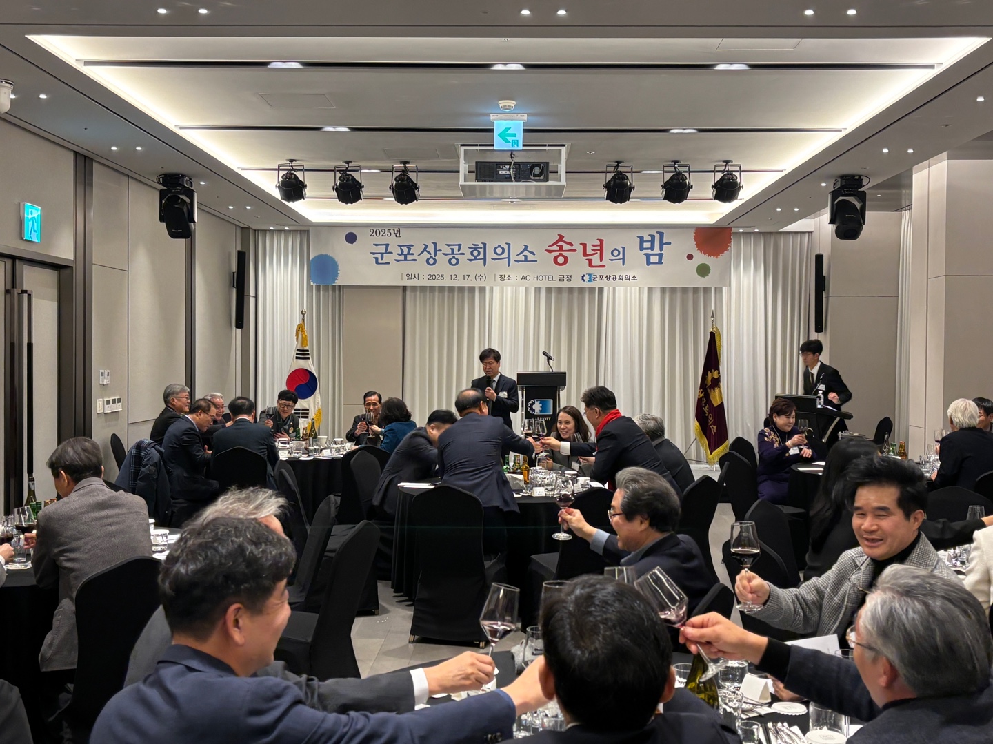 군포상공회의소(회장 김용일)는 지난 12월 17일(목), 관내 AC호텔에서 군포상공회의소를 비롯하여 군포경영인협의회(회장 이태근), 군포소상공인협의회(회장 곽남현), 군포여성경영인협의회(회장 최숙)와 함께 2025년 송년의 밤을 개최하였다.