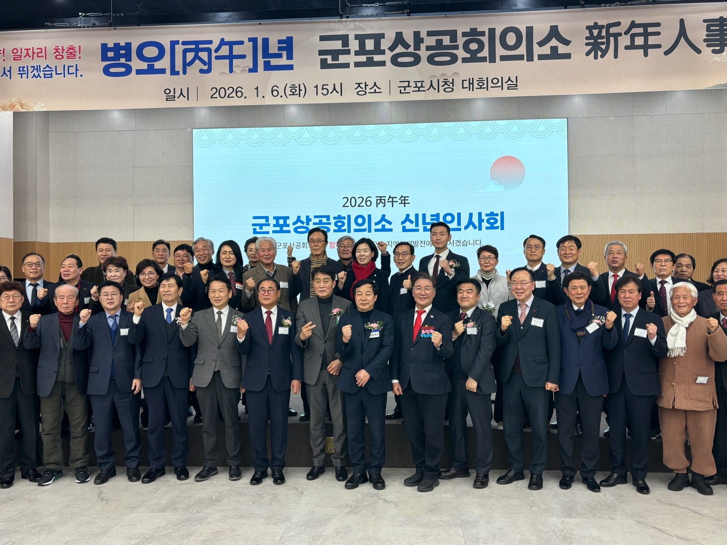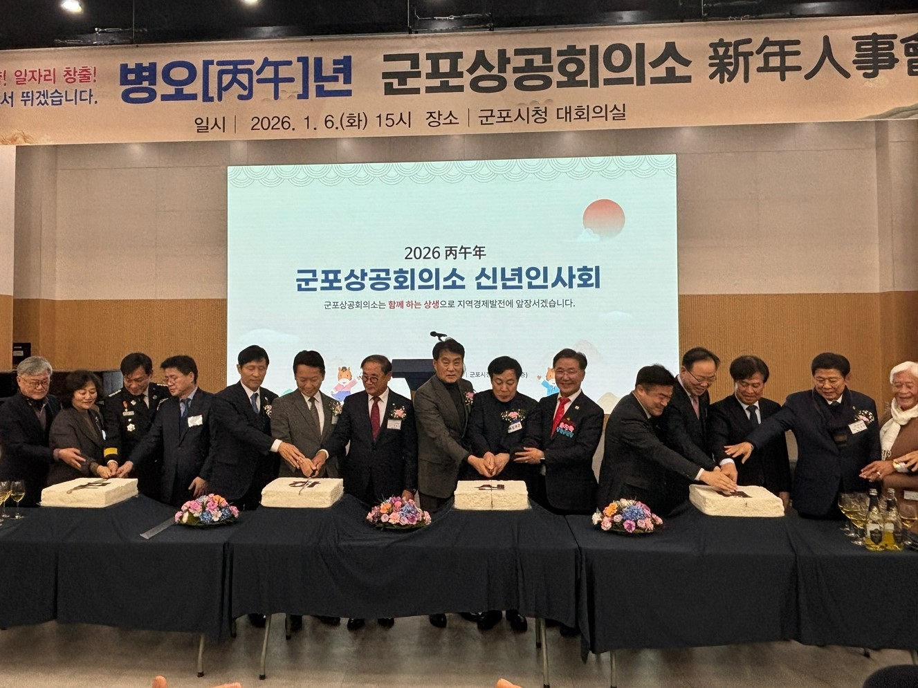 군포상공회의소(회장 김용일)은 지난 1월 6일, 군포시청 대회의실에서 고영인 경기도 경제부지사, 하은호 군포시장, 김귀근 군포시의회 의장, 이학영 국회 부의장을 비롯하여 시,도의원 각급 기관장과 사회단체장, 전 군포시장, 그리고 경제인 등 200여명이 참석한 가운데 2026년 병오년 신년인사회를 개최했다.