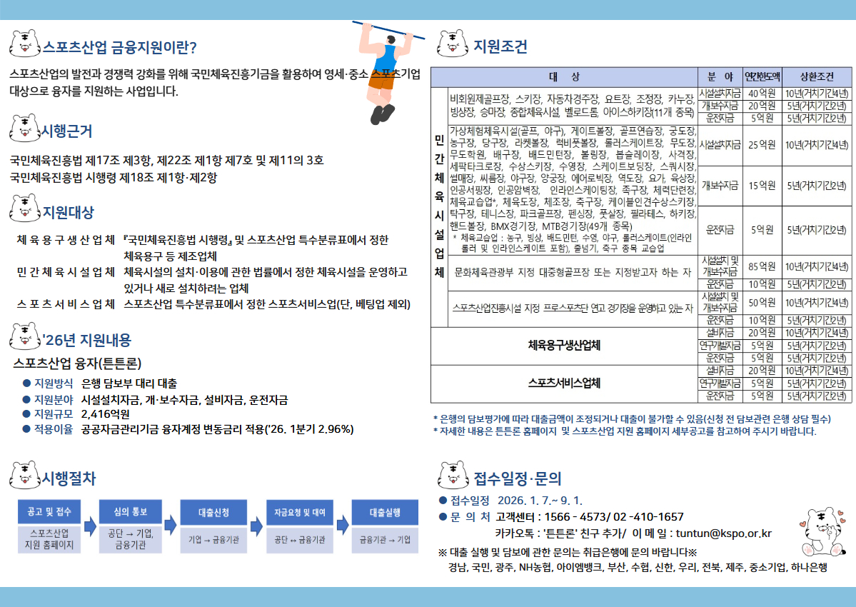 | ‒ | [국민체육진흥공단] 2026 스포츠산업 융자(튼튼론) 신청 공고 |