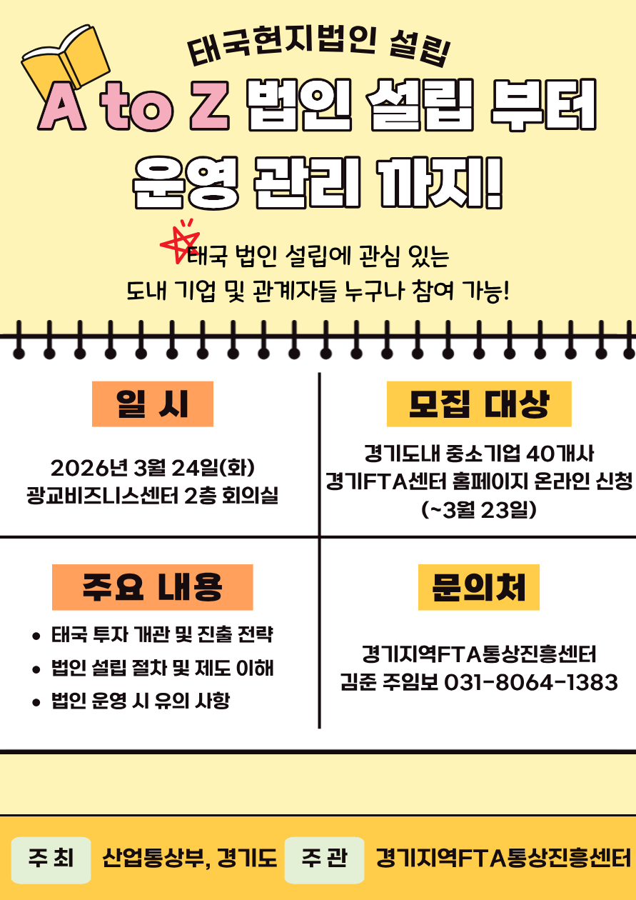 | ‒ | [경기지역FTA통상진흥센터] 태국현지법인 설립 설명회 안내 |