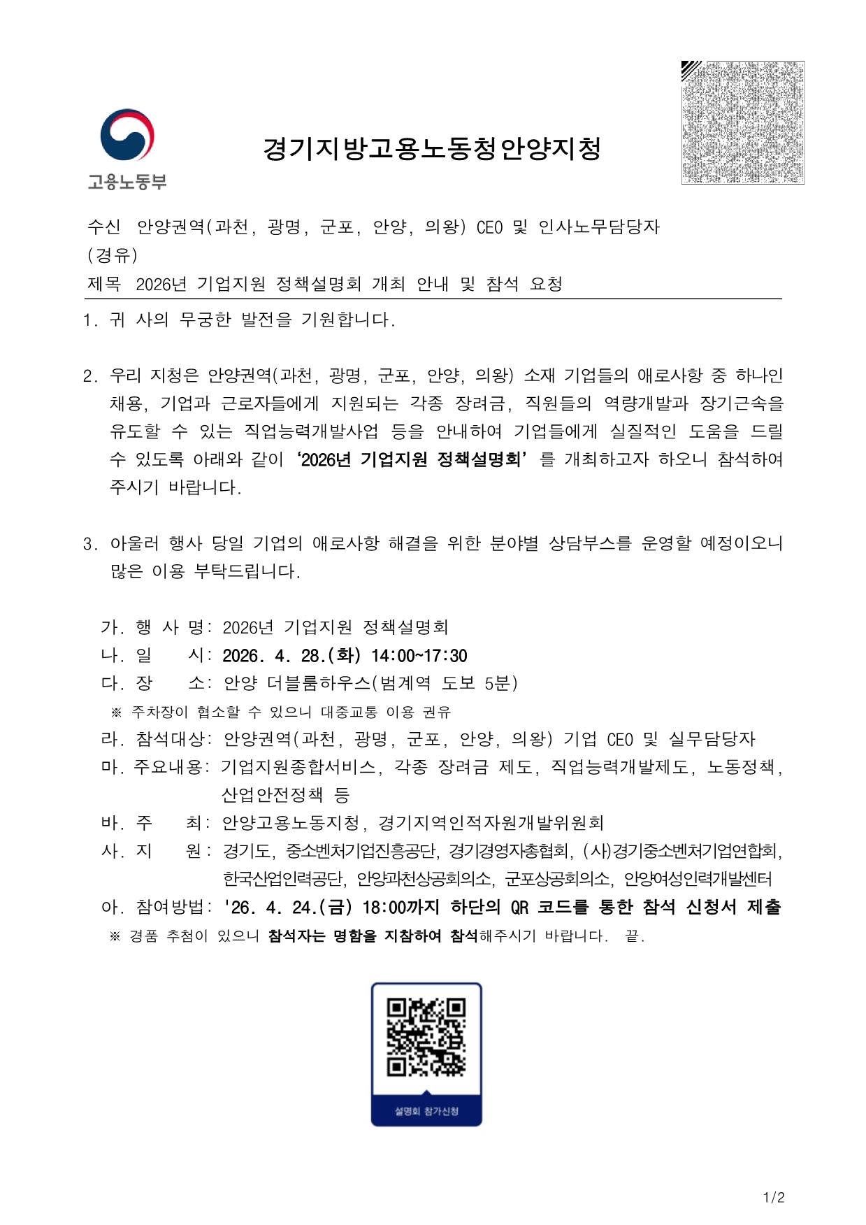 | ‒ | [안양고용노동지청] 2026년 기업지원 정책설명회 개최 안내 |