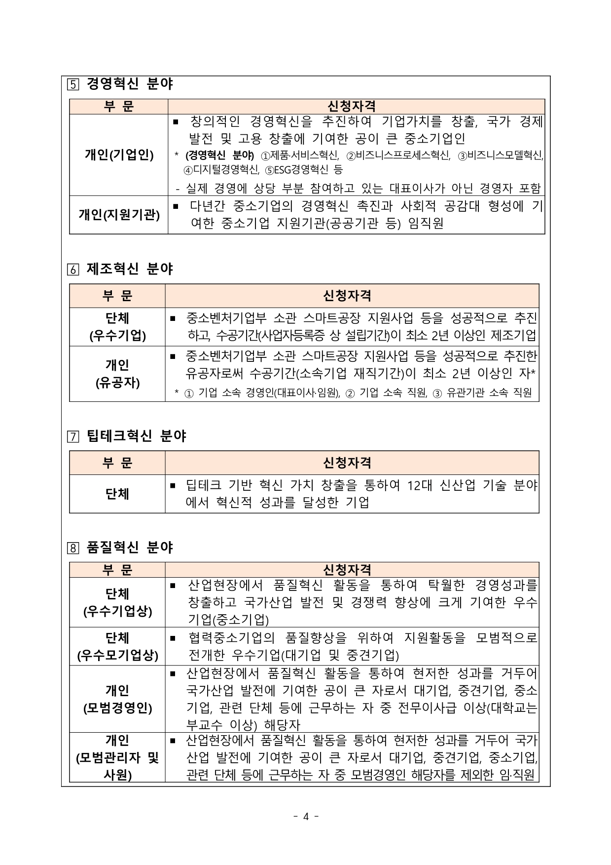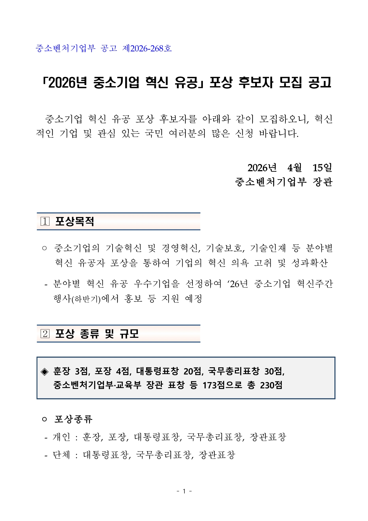| 제목 | [중소벤처기업부] '2026년 중소기업 혁신 유공' 포상 후보자 모집 안내 | ||